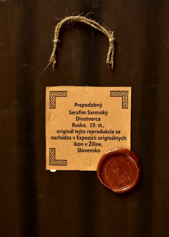 Ikona zobrazuje prepodobného Serafima (Ohnivý) Sarovského Divotvorcu v stoji pri modlitbe. Pravou rukou udeľuje požehnanie. V ľavej ruke má modlitbovú šnúru – čotky, pomocou ktorej sa modlí Ježišovu modlitbu: „Pane Ježišu Kriste, synu Boží, zmiluj sa nad mnou hriešnym“. Za jeho života i po jeho smrti sa udialo množstvo zázračných uzdravení a iných zázrakov, preto má za menom prídavok Čudotvotec – Divotvorca. Prepodobný je u gréckokatolíkov a pravoslávnych veriacich označenie svätého, ktorý sa vyznačoval svätým a asketickým životom. Samotné pomenovanie prepodobný označuje že ide o človeka, ktorý sa vo svojom kresťanskom živote (v čnostiach a pod.) veľmi podobal Kristovi – bol mu veľmi podobný. Jeho tvár je plná lásky a milosrdenstva. Oči pozerajú do budúcnosti. Mal dar proroctva a dar nazerania do ľudského srdca.