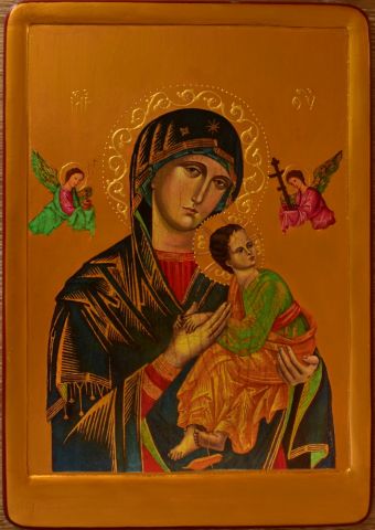 Reprodukcia Ikony Matky ustavičnej pomoci (XV. st.), ktorej originál je v Ríme v chráme otcov redemptoristov. Je vyrobená autorskou technikou v dielni Sv. Antona. Na drevený podklad (MDF doska) s levkasom (prírodné lepidlo na kriedovej báze) je nanesená ikona z kvalitného foto papiera. Ikona je ručne dozdobená s použitím zlatého prášku a akrylových farieb. Ikona je prelakovaná. Na zadnej strane je ikona opatrená certifikátom, voskovou pečaťou Ikonopiseckej dielne sv. Antona a závesným systémom.